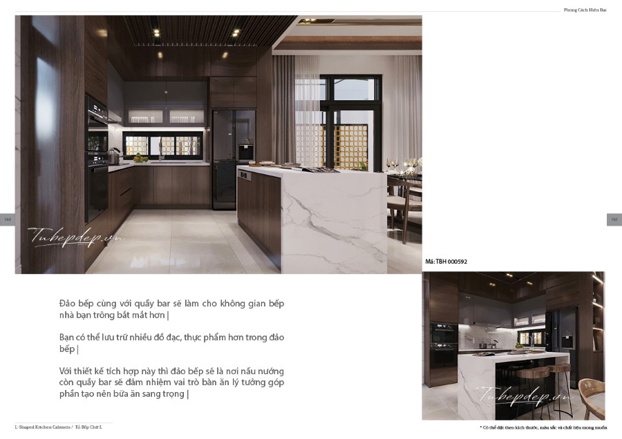Thiết kế nội thất phòng bếp hiện đại với tông màu nâu của gỗ kết hợp với nền trắng của ngôi nhà tạo nên hiện ứng thẩm mỹ và ấn tượng