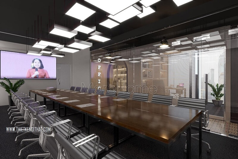 Đồ nội thất văn cao cấp: bàn dài gỗ công nghiệp với ghế đơn chân inox tạo nên một không gian làm việc hiên đại, tiện nghi