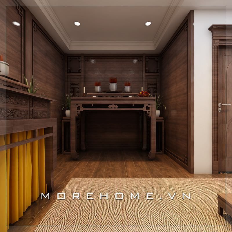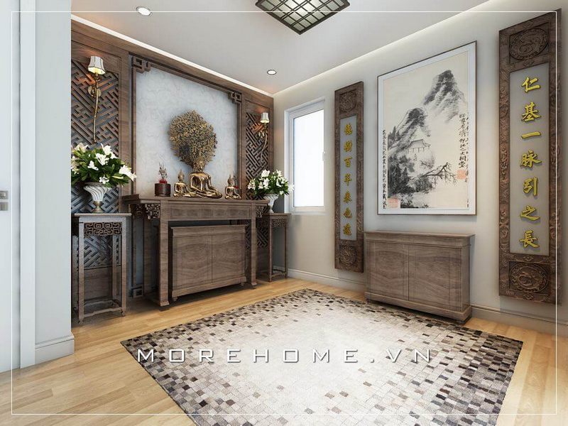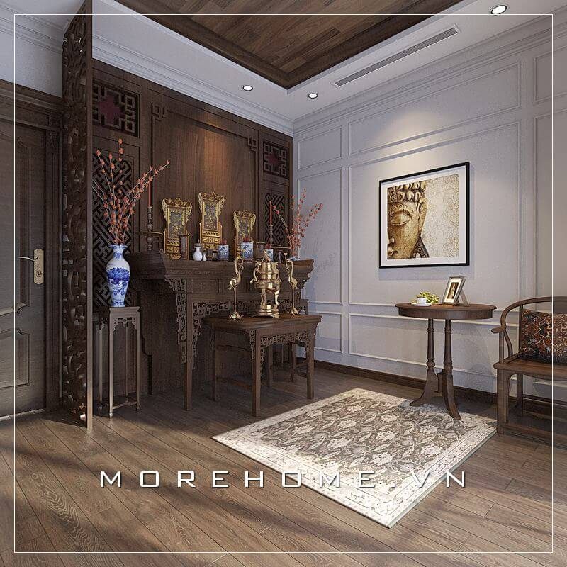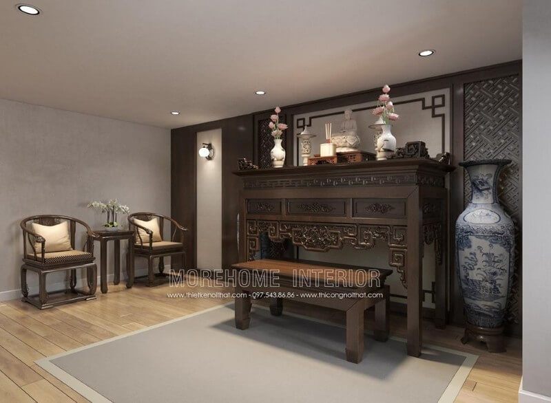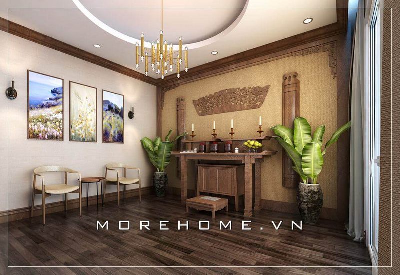 Khu vực thờ cúng tâm linh thành kính và sang trọng với bàn thờ gỗ tự nhiên
