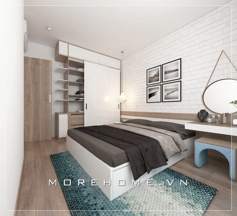 Mẫu thiết kế phòng ngủ chung cư nhỏ hiện đại, tủ quần áo âm tường, giường ngủ tích hợp với ngăn kéo phía dưới tạo thêm nhiều không gian lưu trữ đồ dùng cá nhân của mình
