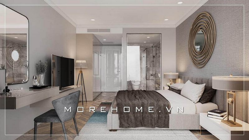 Mẫu thiết kế nội thất phòng ngủ chung cư cao cấp, khu vực nhà vệ sinh được bố trí ngay trong phòng tạo cho gia chủ một không gian riêng tư thuận tiện nhất