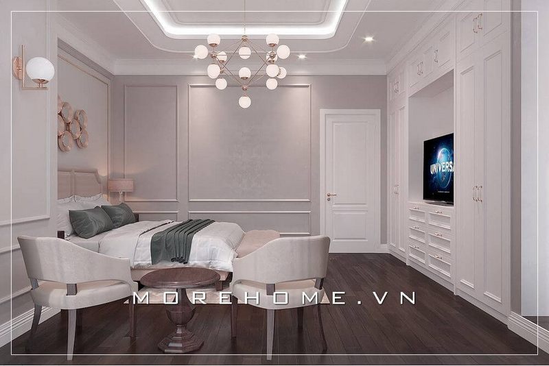 Trang trí nội thất phòng ngủ tân cổ điển có tủ quần áo đối diện giường ngủ khoa học, phong thủy.