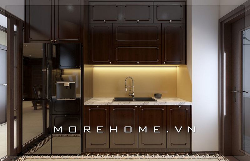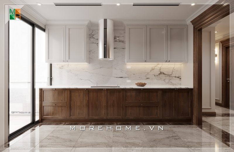 Thiết kế phòng bếp chung cư tân cổ điển sang trọng, thiết bị phòng bếp hiện đại tạo không gian nấu nướng tiện nghi cho người nội trợ