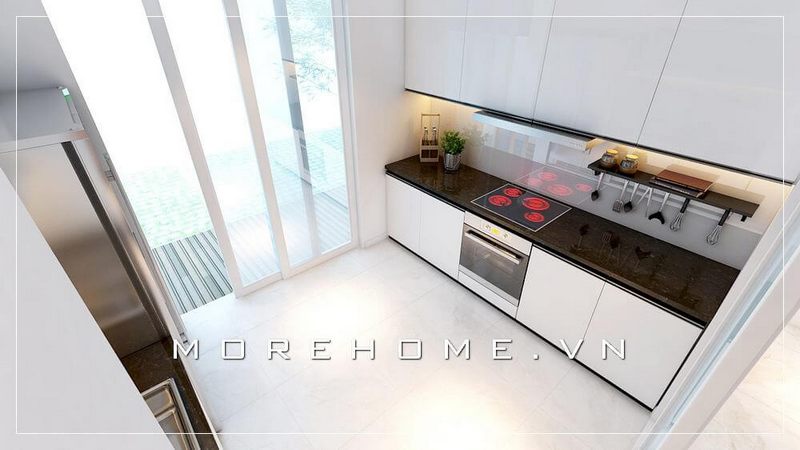 Thiết kế nội thất phòng bếp chung cư với tone màu trắng hiện đại đẹp và trẻ trung