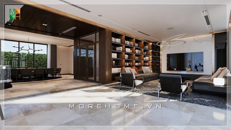 Kệ tủ để sách chạy dài ngăn cách như một vách tường bố trí ở phòng khách của biệt thự, nhà phố vừa sang trọng, vừa tiện nghi.