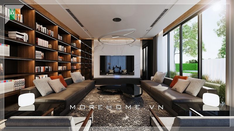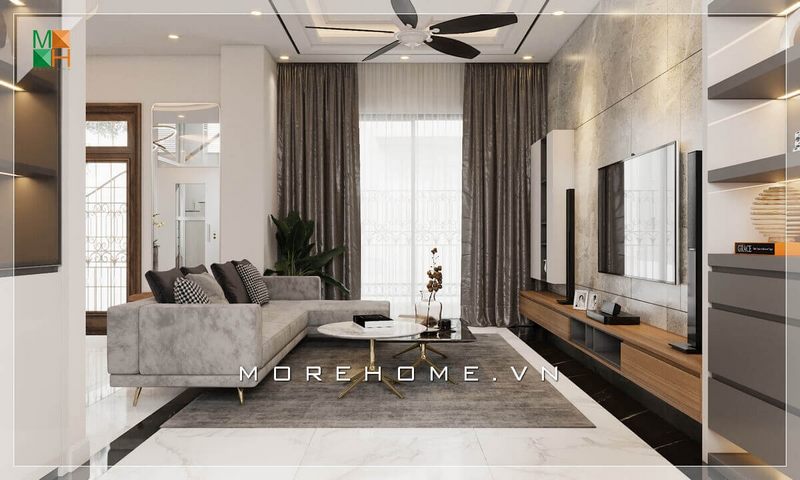 Mẫu thiết kế nội thất phòng khách cao cấp với tông màu xám chủ đạo được yêu thích tại MoreHome
