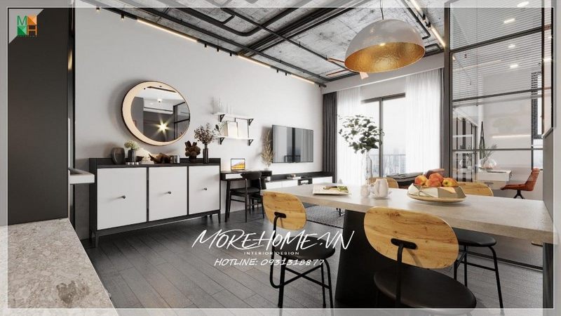 Phòng khách liên kết trực tiếp với khu vực ăn uống, tạo không gian mở và sự thông thoáng cho căn chung cư