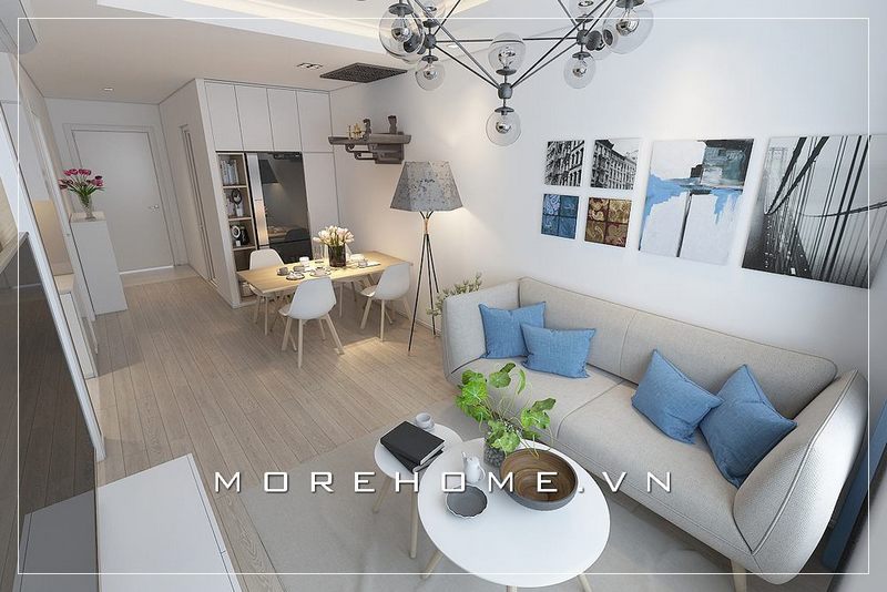 Vừa tối ưu không gian, tiện nghi lại sang trọng ấn tượng với trung tâm nội thất phòng khách căn hộ chung cư là mẫu sofa góc tone trắng tinh tế hiện đại