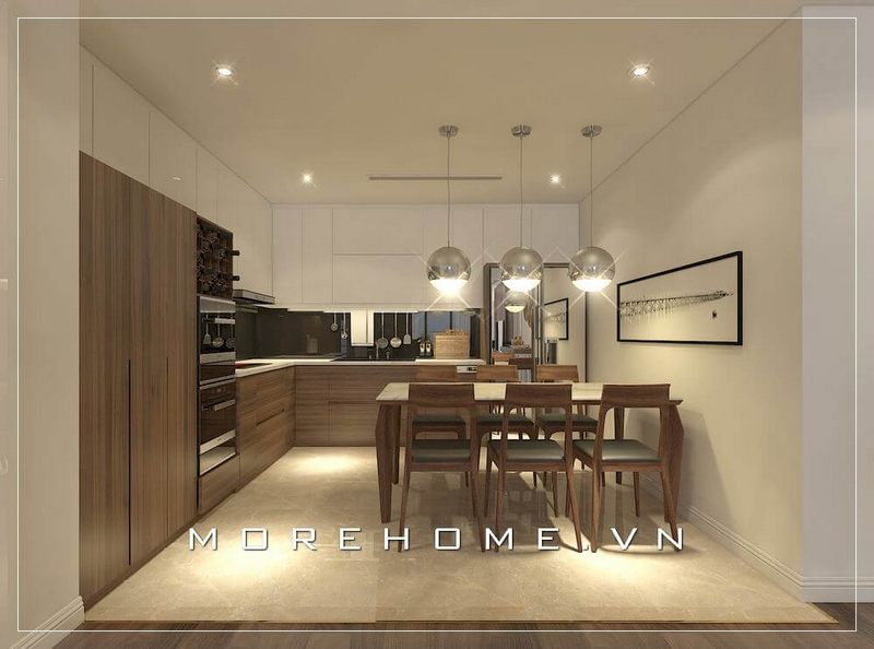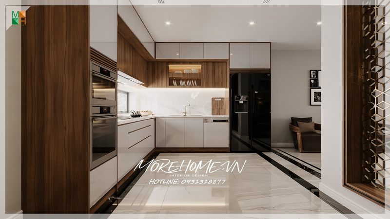 Tủ bếp gỗ óc chó kiểu dáng chữ L ấn tượng, chất liệu gỗ sồi phun sơn trắng cũng được KTS lựa chọn nhằm mang lại không gian nhà bếp nhẹ nhàng, tinh tế và không quá nặng nề, bí bách.