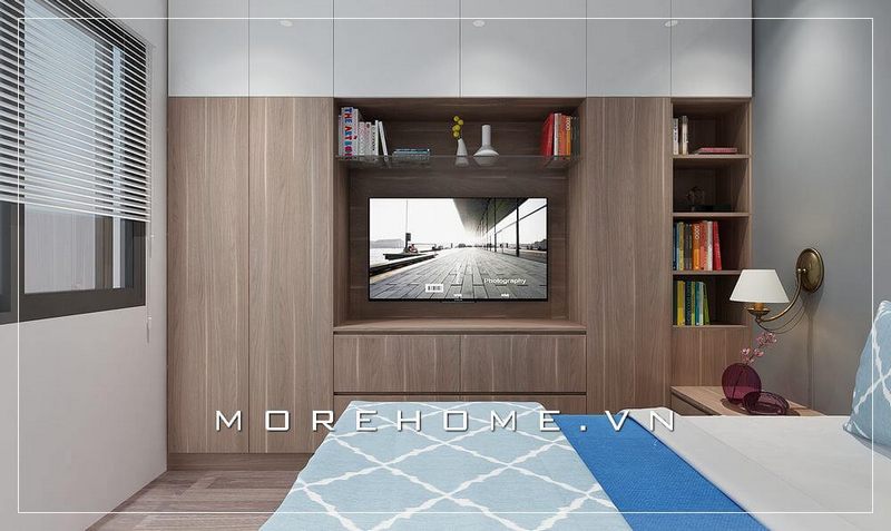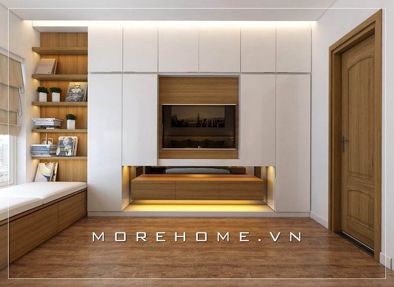 Sự kết hợp hài hòa giữa tủ quần áo và kệ ti vi đa năng mang đến cho căn phòng chật chội trở nên thoáng đãng hơn cả