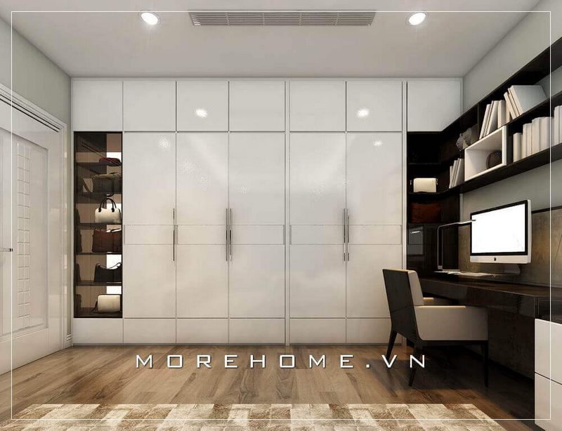 Tủ áo phòng ngủ hiện đại kết hợp bàn làm việc và giá sách chất liệu Acrylic trắng bóng kết hợp vân gỗ An cường
