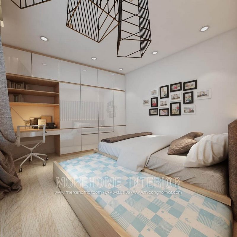 Tủ quần áo cánh mở hiện đại tích hợp với bàn học, sử dụng màu sơn trắng phối với màu nâu gỗ công nghiệp Acrylic tạo nên vẻ đẹp ấm áp cho căn phòng
