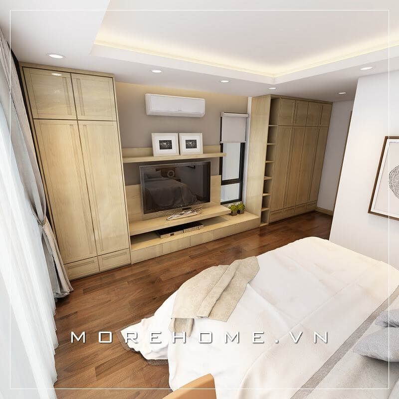 Sự kết hợp hoàn hảo giữa tủ áo và kệ tivi, tinh tế và không nhàm chán, cánh cửa lùa phù hợp với phòng ngủ chung cư, làm cho không gian phòng ngủ thoáng và cảm giác rộng hơn rất nhiều