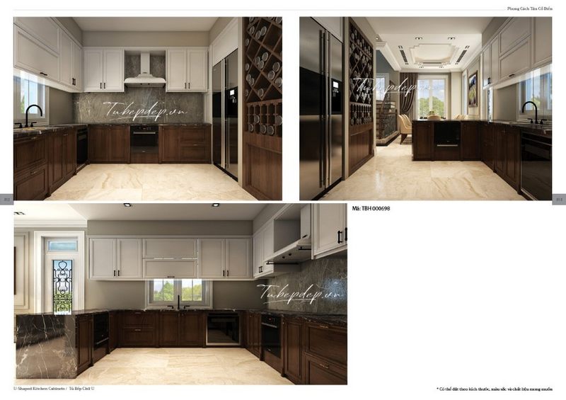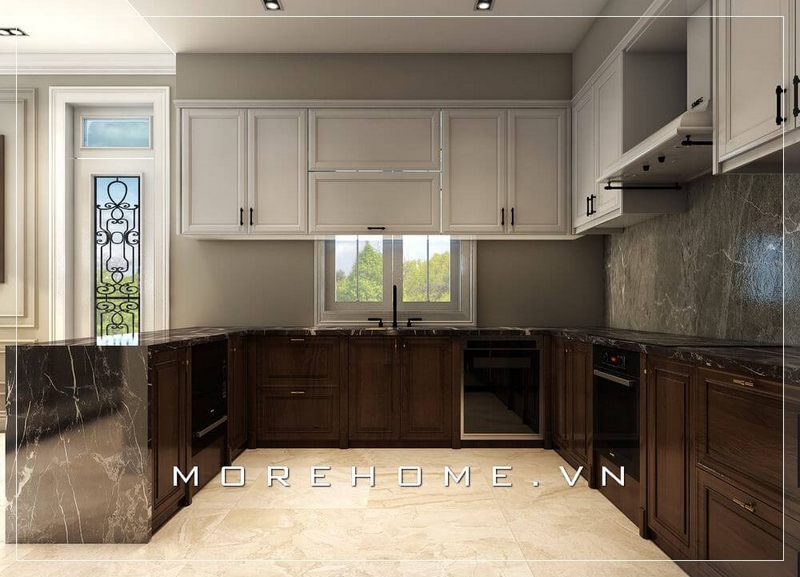 Tủ bếp tân cổ điển với kiểu dáng chữ u có nhiều không gian rộng, gia chủ có thể dễ dàng nấu nướng nhanh chóng và thuận tiện hơn