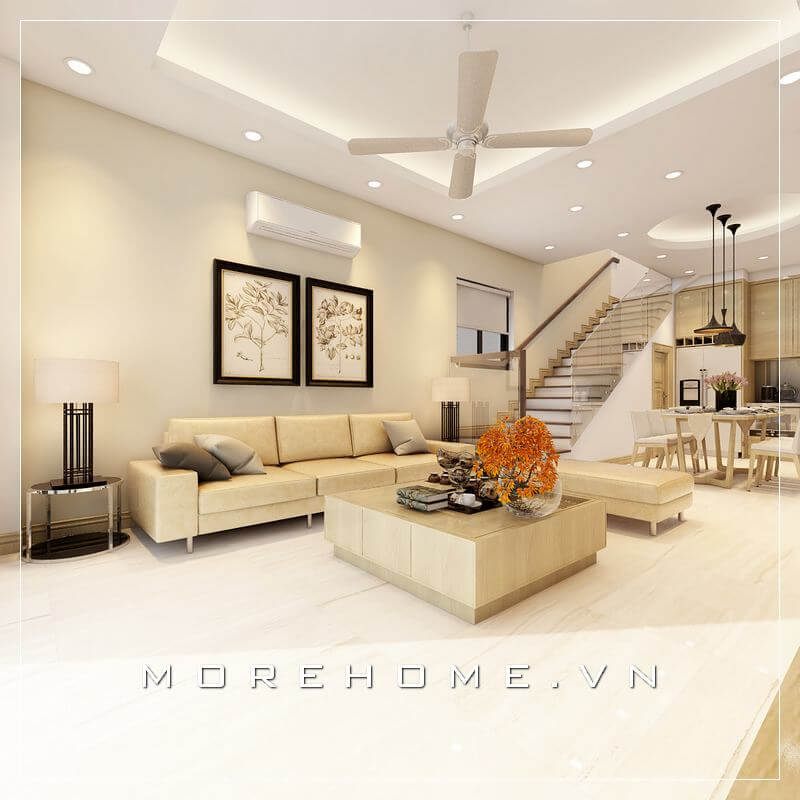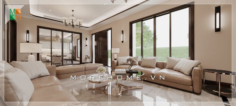Điểm nhấn làm nên đẳng cấp cho mẫu phòng khách này là bộ sofa màu kem hiện đại bọc da sang trọng