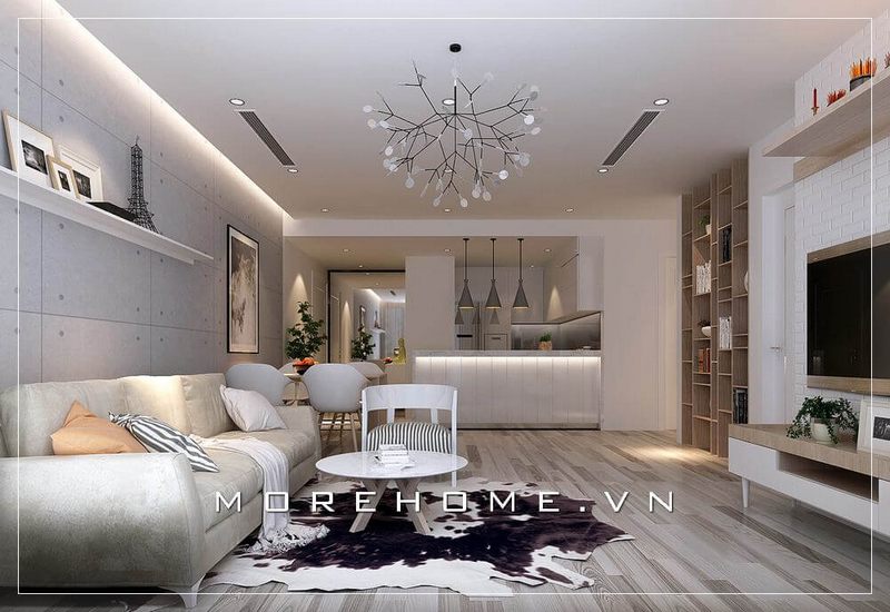 Sofa bọc vài màu ghi xám là điểm nhấn cho phòng khách chung cư