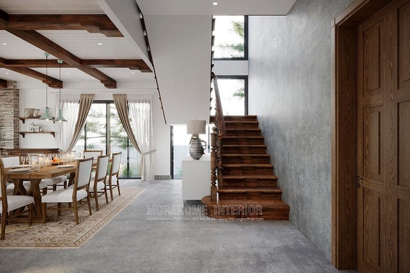 Mẫu cầu thang gỗ đẹp được thiết kế cho biệt thự chùa Thầy, Quốc Oai, Hà Nội.