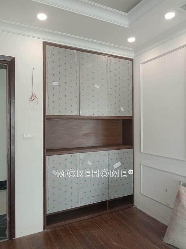Tủ giầy gỗ laminate có thiết kế để tối ưu hóa không gian tích trữ và có một bề mặt chạm trần.