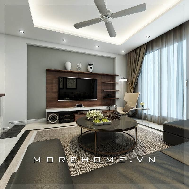 Mẫu thiết kế phòng khách chung cư hiện đại được tạo nên bởi sự kết hợp của bộ sofa bọc vải xám và trắng ấn tượng và các đồ nội thất nhỏ gọn, góp phần tạo nên không gian thoải mái.