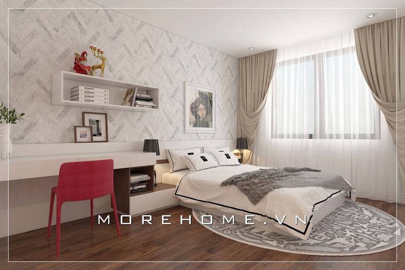 Giường ngủ chung cư được thiết kế theo phong cách hiện đại, đơn giản cùng gam màu trắng tạo sự đồng nhất cho cả không gian phòng ngủ