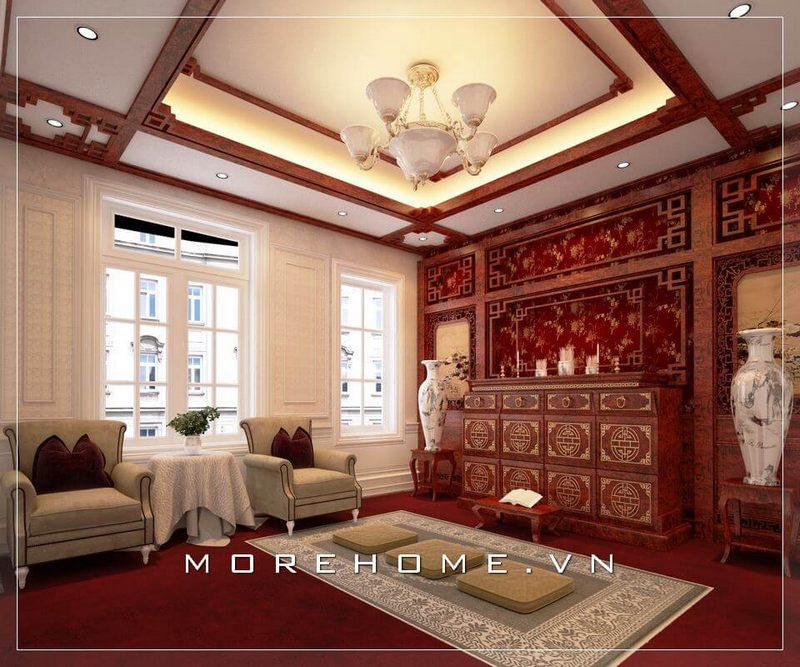 Mẫu thiết kế phòng thờ kiểu nhật hiện đại với tông màu đỏ trầm mang đến sự độc đáo ấn tượng cho phong cách thờ cúng