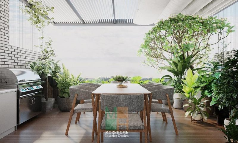 Không gian được bày trí sắp xếp nhiều chậu cây xanh mát giúp điều hòa bầu không khí trong lành dễ chịu.