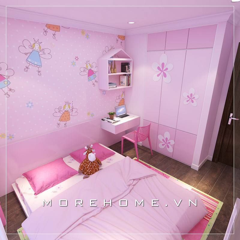 Thiết kế nội thất phòng ngủ trẻ em hiện đại với sự kết hợp hoàn hảo của tủ quần áo màu trắng, tủ quần áo gỗ công nghiệp...