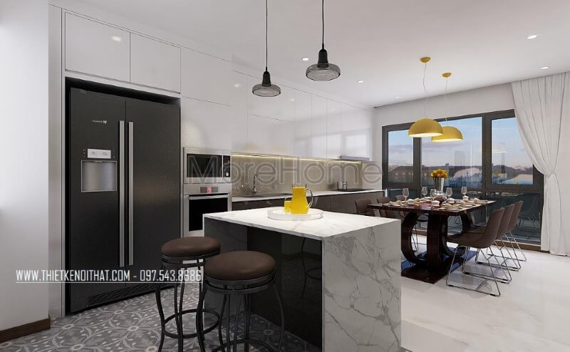 Thiết kế nội thất phòng bếp chung cư hiện đại sử dụng tone màu trắng- đen giúp không gian bếp hài hòa và ấn tượng hơn